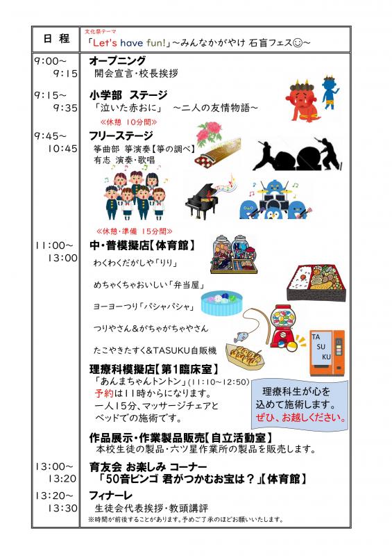 筝曲部発表「箏の調べ」、児童生徒音楽有志発表「Tutti! Great Family」では、いままで練習してきた成果を存分に発揮して、会場の皆さんを素晴らしい音楽で胸いっぱいにしていました。ほかにも作業製品販売や、視覚障害者用具展示、育友会によるお楽しみなどがあり、ステージ発表以外でも文化祭を楽しんでいる様子が見られました。