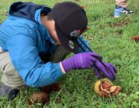 栗拾いを楽しむだけでなく、「いがは木にどのようについているのかな?」「いがの中はどうなっているのかな?」と、いが栗の様子を軍手越しに手で触れて熱心に観察する姿も見られました。