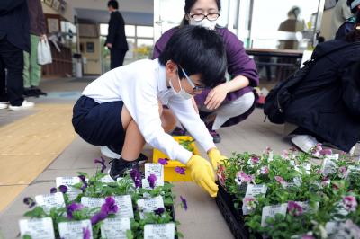 11月3日、校内美化の一環として、育友会の企画で花苗植え活動を行いました。いろとりどりのパンジーやビオラなどの苗を「どれにしようかな」と嬉しそうに選んで和気あいあい。土の感触も気持ちよかったようです。