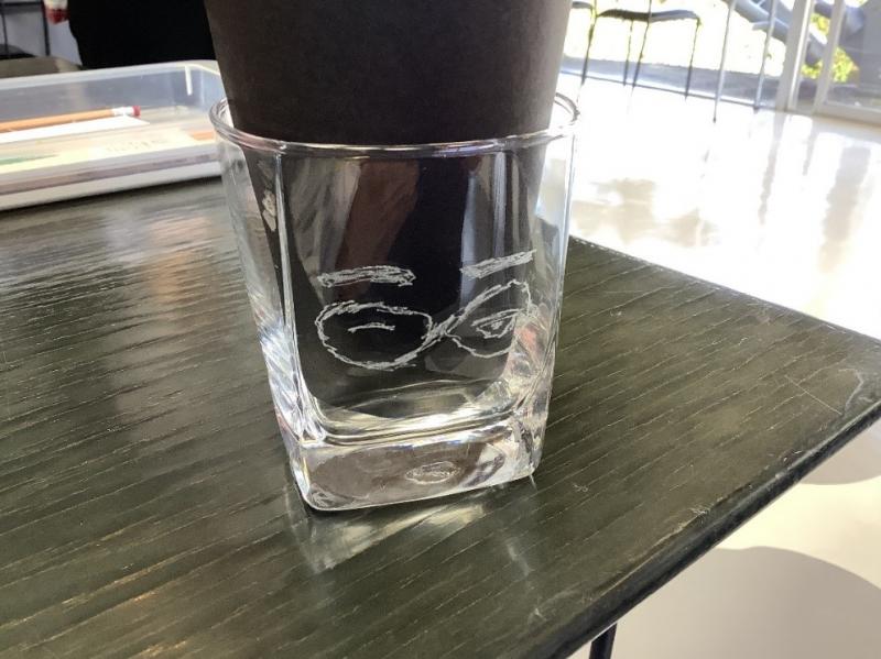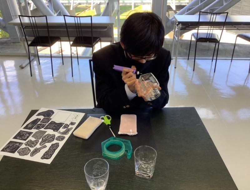 鉛筆型のルーターを使ってコップに模様を削って描く体験をし
