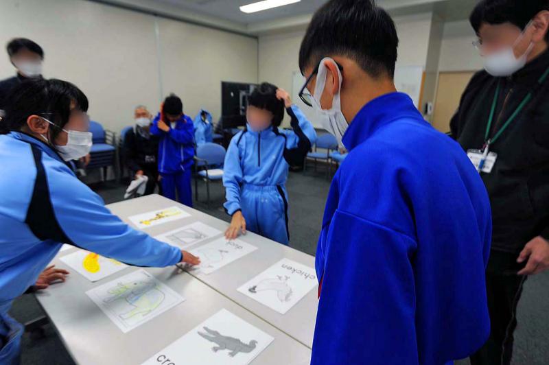 どんなことをするのかな?と少し緊張した様子の4人でしたが、英語の自己紹介や手話を交えた英語の歌の合唱、そして英単語の書かれたカードを使ってのカルタ取りなど、時間が経つにつれ、いつしか雰囲気にも慣れ、笑顔も見られるようになっていきました。