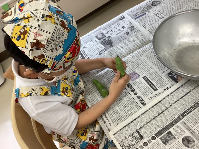 その、さやむきのお手伝いをしました。ふかふかなベッドの上に並んでいる、かわいいそら豆を取り出しながら、「けっこう固いな」「二つはいってた!」「ぶら下がってる。鉄棒みたい!」「なんで、そら豆っていうのかな?」とお話しながら、たくさんむくことができました。