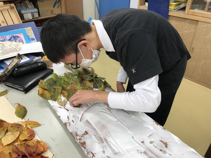 図工の時間にグラウンドで拾ってきた落ち葉を使って作品づくりをしました。