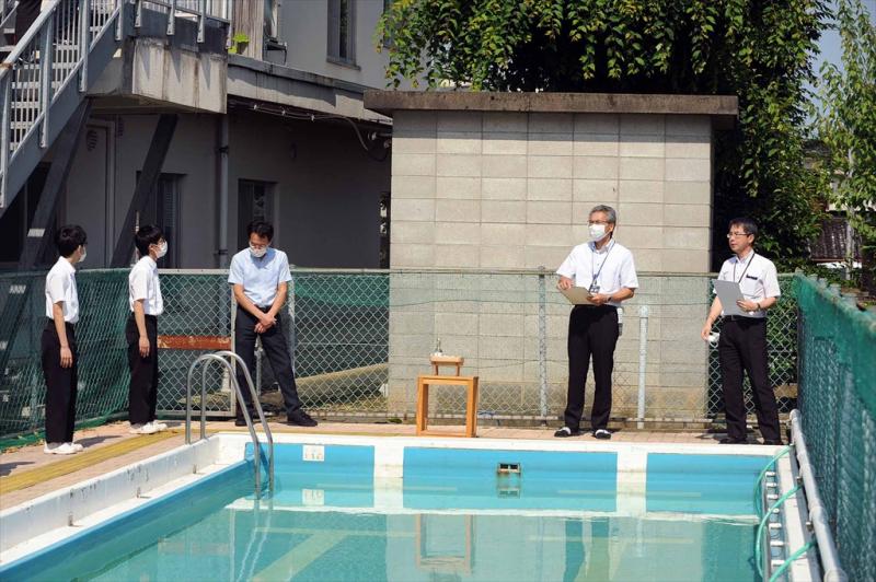 全員で水の神様に安全を祈願した後、校長先生の話を聞き、生徒会長たちが清めの塩やお神酒をプールにまいて、式は終了となりました。