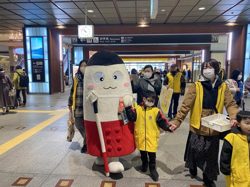 3月10日(日)金沢駅で、児童生徒、保護者、教職員及び、県内の視覚障害の団体の総勢約50名で、コロナ禍で中止になって以来、5年ぶりのティッシュ配りをしました。埼玉県より、白杖の妖精「つえぽん」も、駆けつけてくれ、盛り上げてくれました。