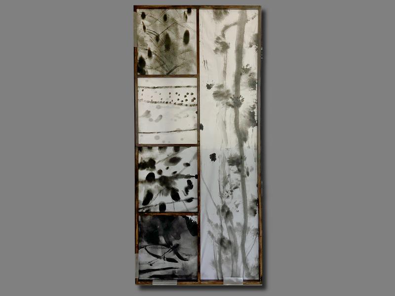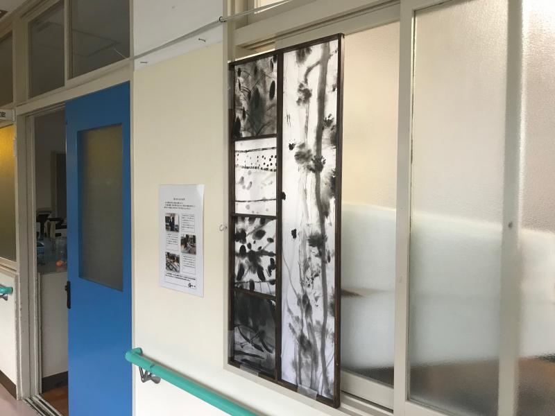 水の量を調整して墨の濃淡を変えながら、何枚もの墨絵を描きました。描きあがった墨絵は、木枠に貼って1枚の作品に仕上げました。