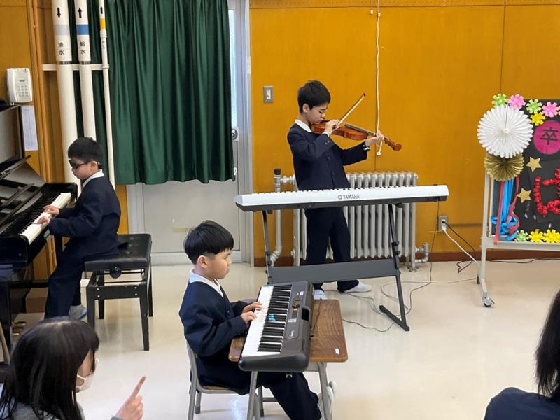 会が始まると、1年生はゲームの説明、3年生は総合司会をがんばりました。6年生はみんなに感謝の気持ちをこめ、楽しいクイズとヴァイオリンの演奏、お礼の挨拶を立派につとめました。6年生の希望で、3人で「キラキラ星」ならぬ「キラキラ盲学校」の合奏を楽しみ、素敵な思い出の1ページを作ることができました。