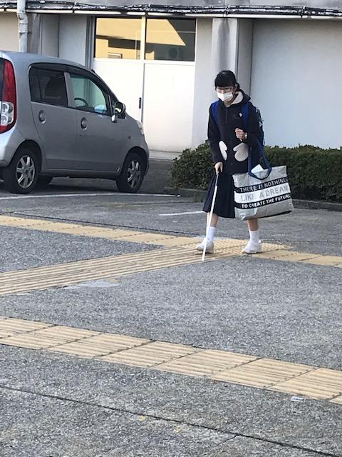 中学部2年生の生徒がたくさんの練習を重ねて、寄宿舎から学校まで、外を通って白杖歩行で登下校できるようになりました!