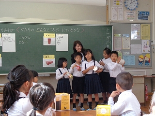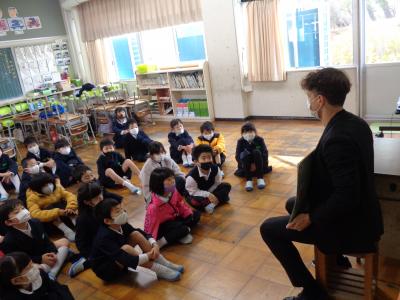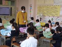1年生は毎月1時間、ケリン先生と英語の勉強をしています。ケリン先生はほとんど日本語を使わずに授業をしていますが、子どもたちは今までの学習を振り返ったり、フィーリングで先生が何を言っているのかをつかんだりして学習を進めています。困った表情を見せる子は誰もいません。音楽に合わせて動作をしながら英語を言うことで、1日の生活の流れを英語でどう言うのかを学んだり、カードを使って今まで習った「形」「動物」「色」などの学習を行ったりと次から次へと英語を聞いたり話したりするテンポの良い学習が進められていました。どの場面も1年生の笑顔はキラキラしています。大きな絵本を使って0から10を英語で言うことを自然な形で学習する1年生の姿は、未来に向かって頼もしく成長する予感を感じさせる姿でした。