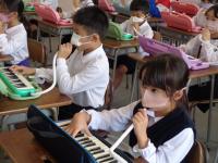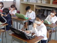 音楽室をのぞいてみると、1年生が鍵盤ハーモニカの練習をしていました。今回は、ドの鍵盤の場所を覚える学習をしているようです。高いド、低いドの音を実際に出していました。場所を覚えたら、曲に合わせてタイミング良く「ド・ド・ド」と音を出すと合奏のような雰囲気になり子どもたちも楽しそう。飛沫感染予防のため、鍵盤ハーモニカ教室で教えていただいたマスクのつけ方をしています。先生のお話が始まると音を出すのをやめて静かに話を聞く姿や音楽がなり始めるとさっと唄口を加えて音を出す準備をする姿から、1年生が音楽の学習を楽しんでいる様子が伝わりました。今日の授業で、高いドと低いドの場所をしっかり覚えることができたようです。