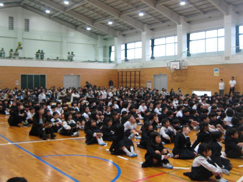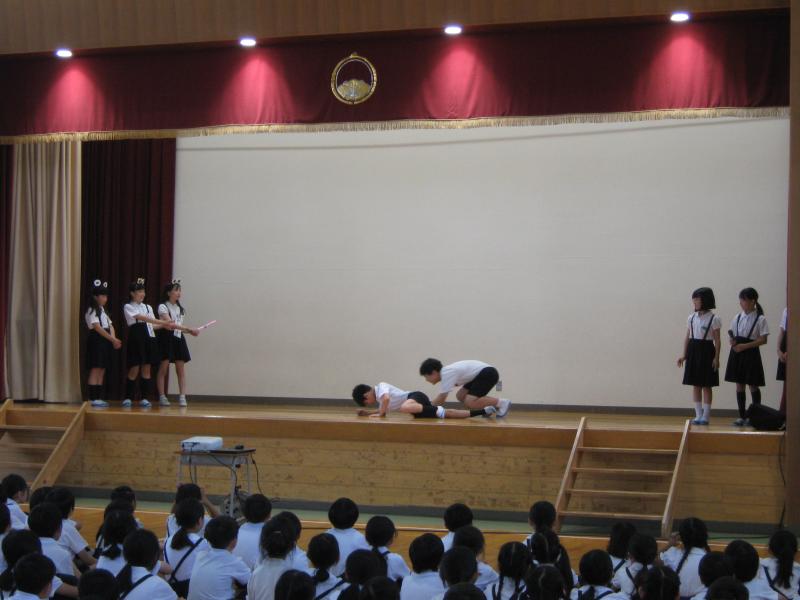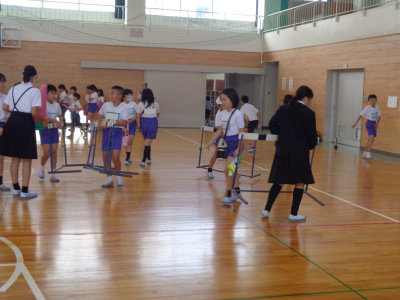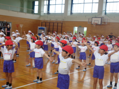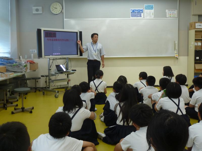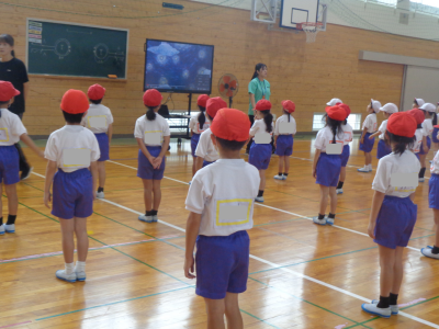場所移動の流れを身につけるために、何度もくりかえし移動練習に取り組んでいた低学年と中学年。とてもスムーズに移動できるようになりました。先生が全体指導している間は、しっかりとお話を聞く姿もたくさん見られました。来週からは、実際に運動場に出て実際の広さを確かめながら練習を重ねていく予定です。
