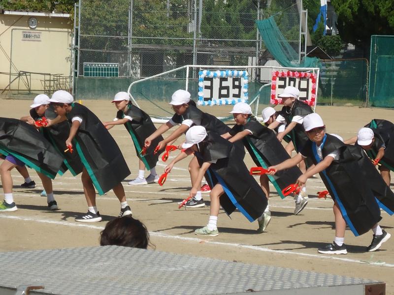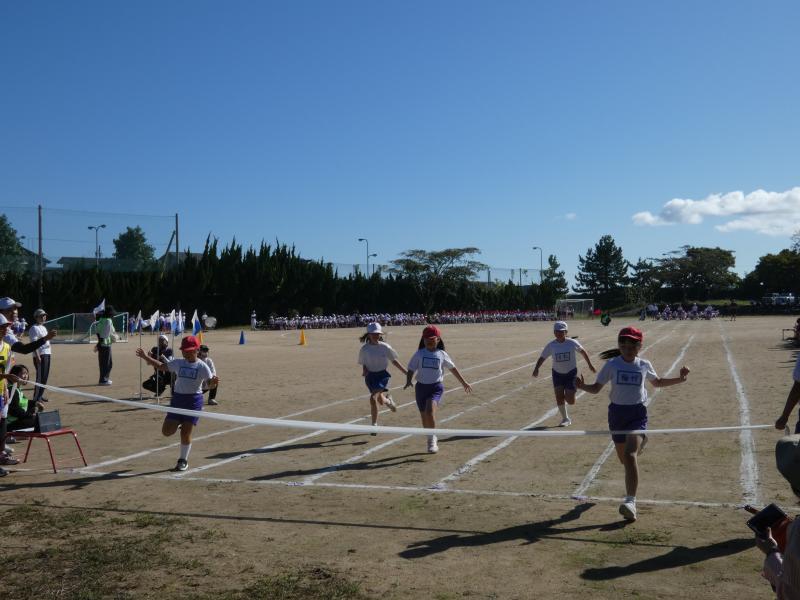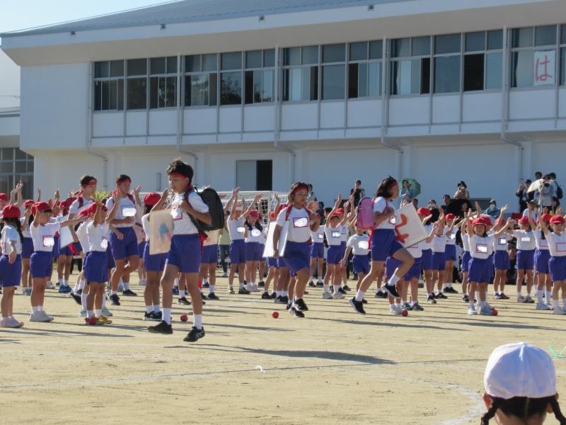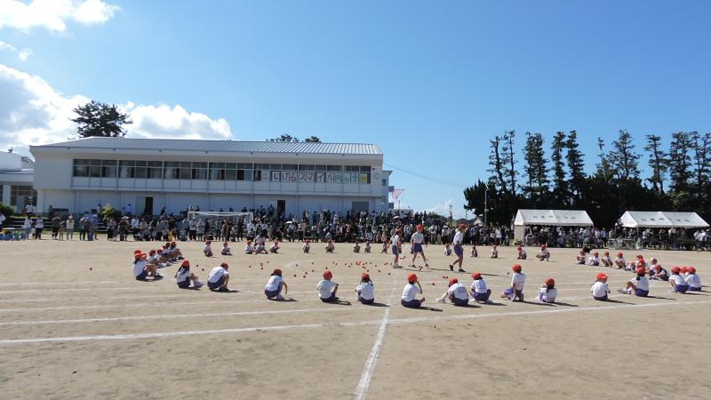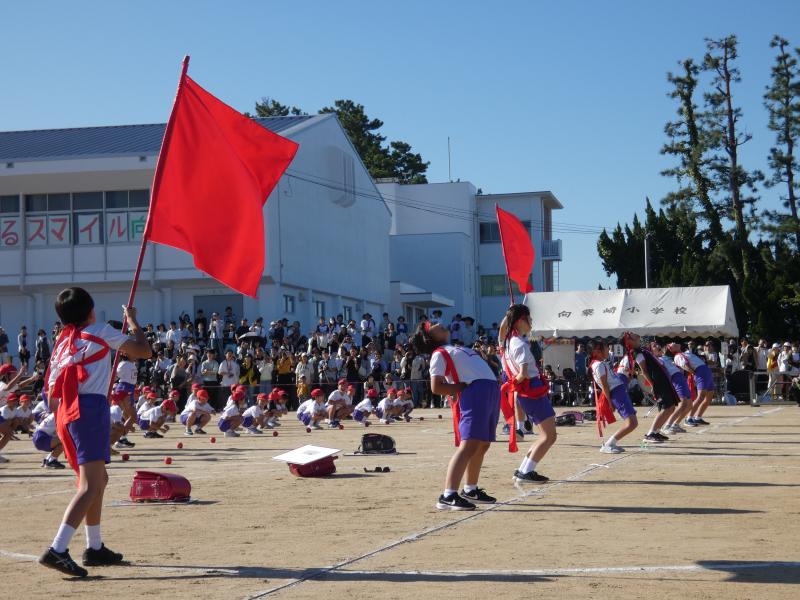 清々しい秋晴れの下、「はじけるスマイル向っ子」のスローガンを掲げ、個人走・団体演技・団体競技などをはじける笑顔で頑張る子ども達の姿が見られました。