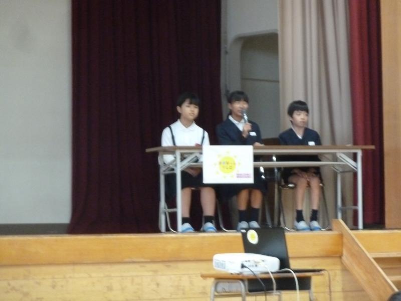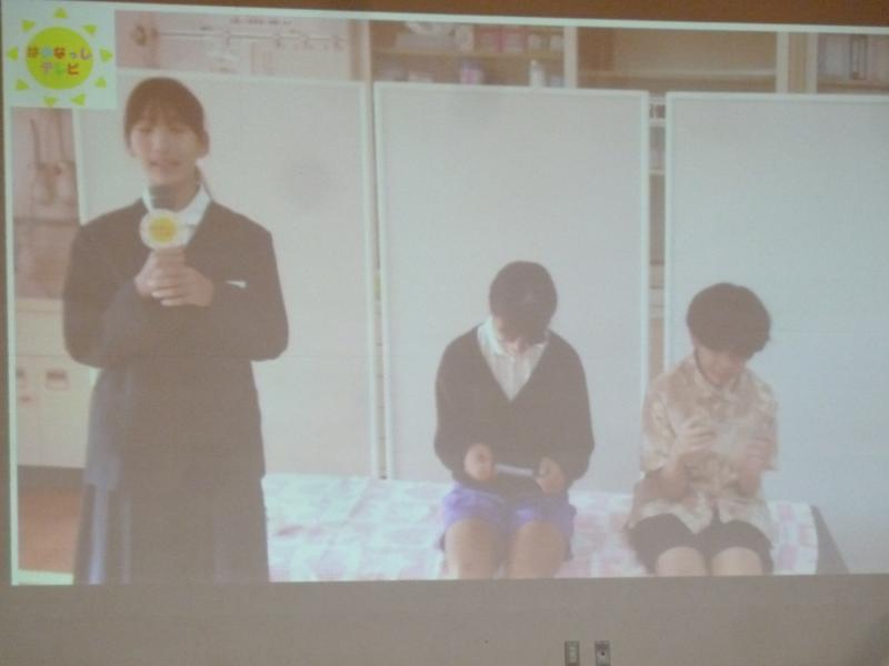 最初に、保健委員会が、メディアアンケートから分かったことをニュース番組風に発表しました。後期保健委員の皆さんは当日の発表をし、前期保健委員の皆さんはビデオで登場しました!