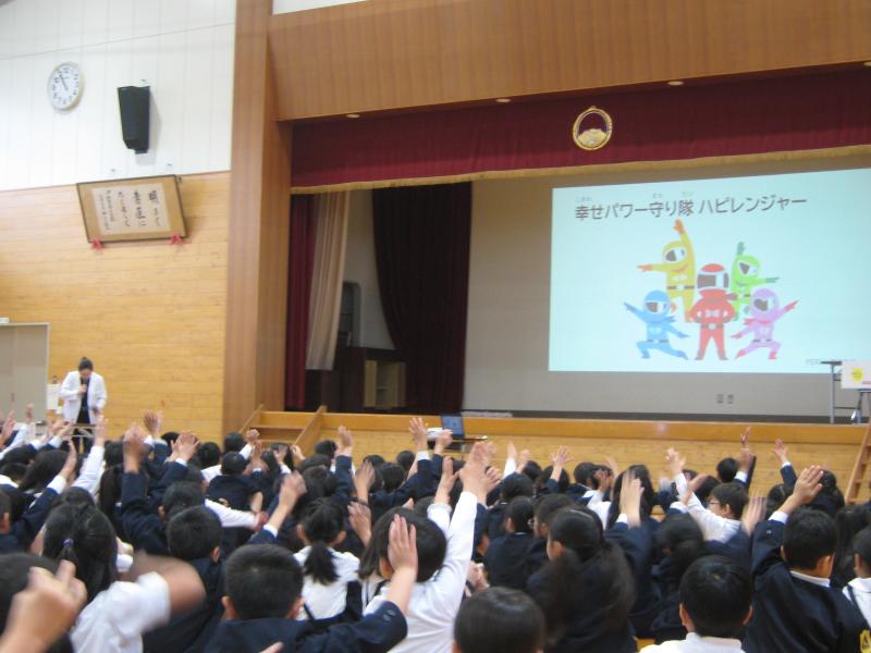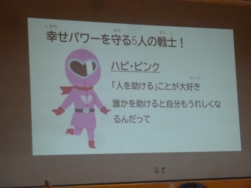講師の橋本先生からは、どんなときに幸せを感じるかを『幸せパワー守り隊 ハピレンジャー』のキャラクターを通して紹介していただき、メディアを長時間使用することでその幸せパワーが奪われているかもしれない、ということを教えていただきました。