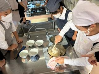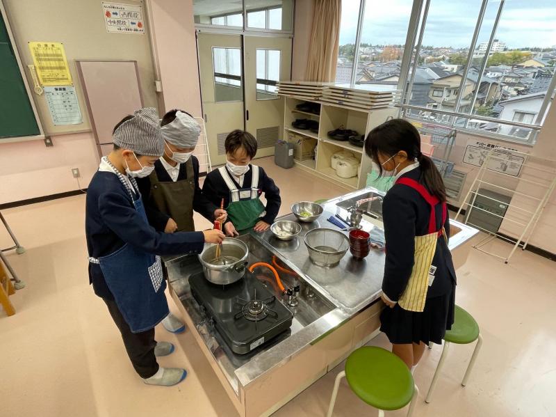 家庭科で調理実習を行いました。今回は、ご飯とみそ汁です。ご飯はお鍋で炊きました。お味噌汁は、煮干しでだしを取り、大根や油揚げ、ネギを入れてつくりました。みんな手順を確かめながら上手につくることができました。ご飯は、おこげもできていましたが、おいしくいただきました。
