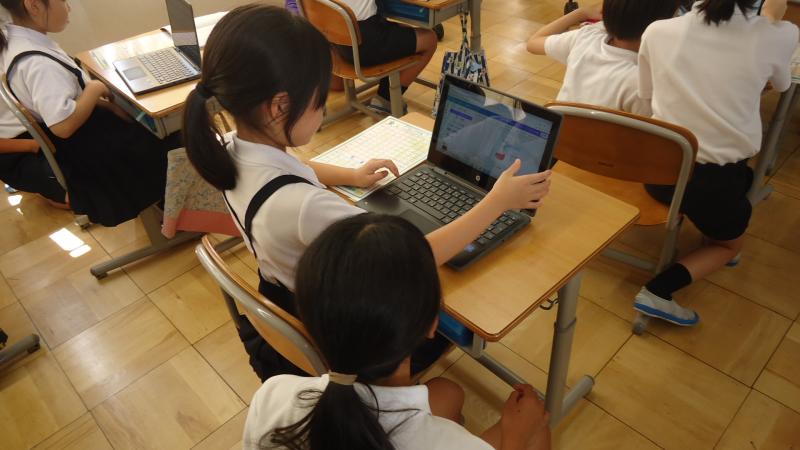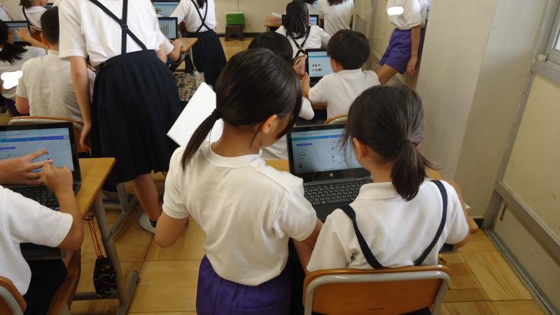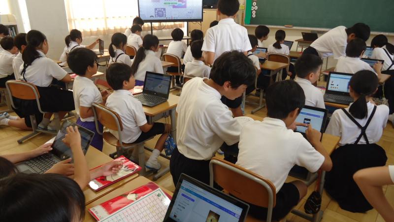 授業では、教具や楽器を使ったり、ノートにしっかりと自分の考えを書いたり、外国語を話したりする様子が見られました。