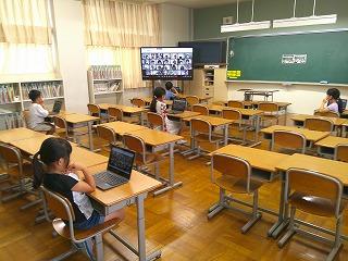 全校で応援練習に取り組んでおり、教室に、1年から6年生の異学年で構成されたはまなすグループの子どもたちが集まり、6年生を中心に練習をしているためです。