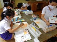 図工室では、全員が一生懸命色塗りをしています。どうやら、自分の竹とんぼをデザインしているようです。模様を付けると回したときに模様が変化するのも楽しみですね。お気に入りの竹とんぼはできたかな?