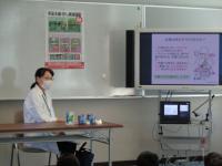 また、たばこは副流煙が大きな問題になっています。薬剤師の先生が、風のない時に一人の人がたばこをたしなんでいる時にそのけむりはどこまで届くのかという問題を出され、半径7mであるという答えを聞いた子どもたちはびっくりしていました。また、実際のその場で7mを測定してみました。座っていた子どもたちが全員半径7mの範囲内に入る大きさだったので、さらに子どもたちはびっくりしていました。