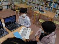 クロムブックを使って国語の時間の真っ最中。自分が調べたことわざを分かりやすく伝える学習をしていました。ことわざの意味にぴったりのイラストも上手に見つけていました。ことわざの意味は、図書館の資料を参考にまとめているようでした。