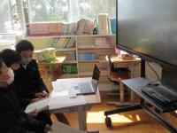 同じ長休みの時間帯に5年生は授業をしていました。台湾の小学校との交流学習です。台湾と時間を合わせる都合上、休み時間に交流をすることになったようです。直接会って交流するのとは違うので、画面から出てくるボリュームが小さかったりお互いの表情が小さな画面から伝わりにくかったりする不都合はありましたが、子どもたちは自分たちのことを一生懸命伝えていました。