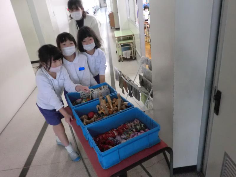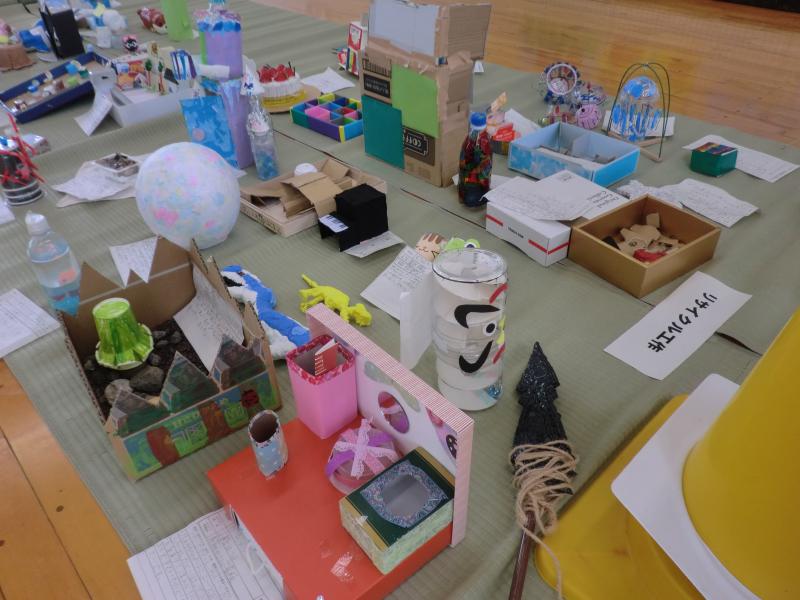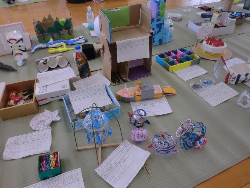 お家から持ってきた材料や学校で拾った木の実などを組み合わせて自分で工夫しながら楽しいおもちゃを作っていました。できあがったら友達と遊び合うのかな? 今から遊ぶのが楽しみになりますね。
