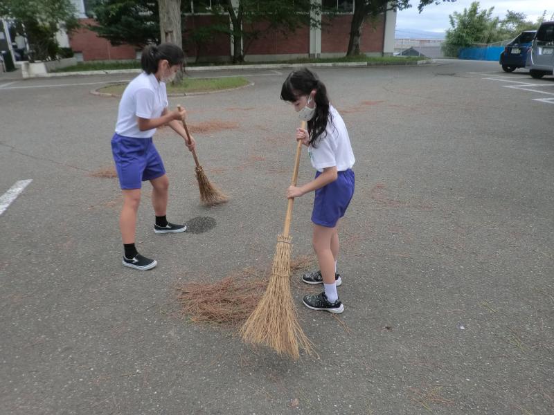 玄関前駐車場では、今日もかわいいボランティアのみんなが自分より大きな竹ぼうきを「うんとこしょっ!」と扱いながらきれいにしてくれています。