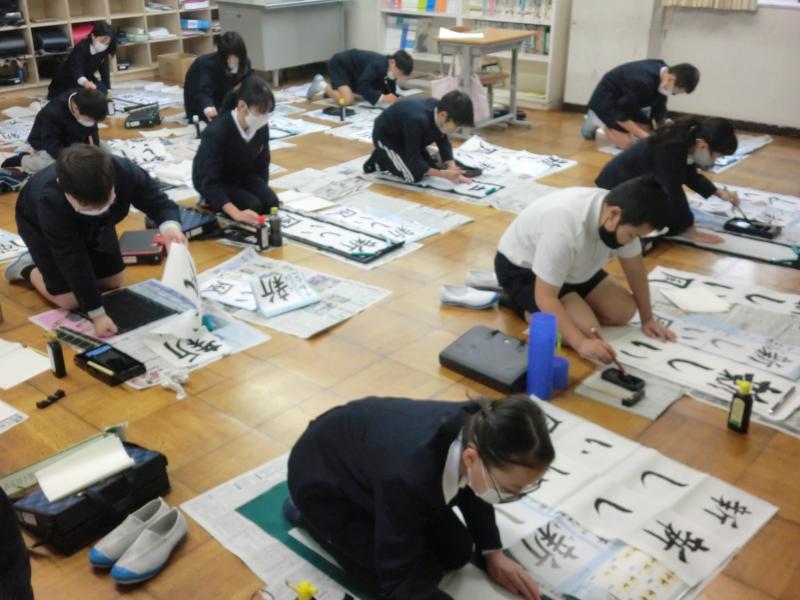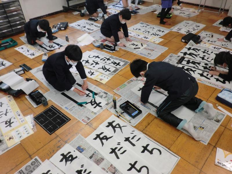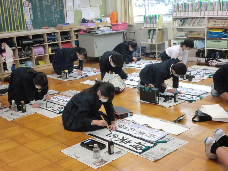 2限は全校児童参加の書き初め大会。みんな、2学期から冬休みにかけてがんばった練習の成果を発揮・・・・・・ 春の海」をバックに、集中して一生懸命に取り組んでいました。