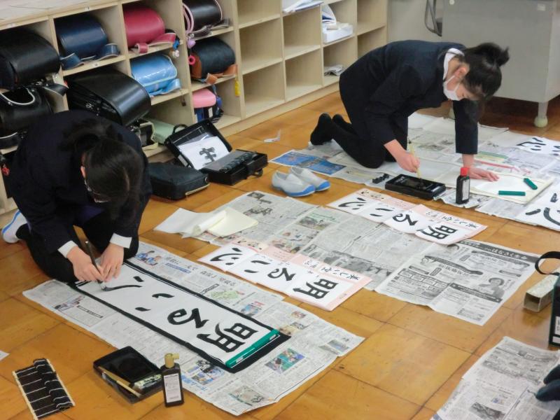 1時間目の始業式のあと、2時間目は書き初め大会を行いました。1、2年生は硬筆、3~6年生は毛筆です。休みに練習してきた成果を出そうと、子どもたちは真剣そのものの表情で取り組んでいました。練習通りに出来た子もいれば、練習の方が上手に出来たと悔しそうな表情を見せる子もいましたが、廊下には見事な作品が並びました。