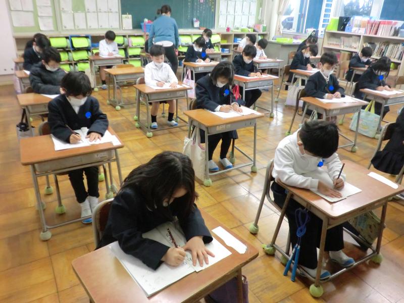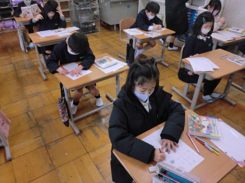 今まで学んできたことの力試し。漢字50題テストに挑戦中。テスト前には先生にはね・はらいに気をつけて丁寧に書くことをアドバイスされていたため、どの子もいつもよりも丁寧に書いていました。思い出せない字がある時は、眉間にしわを寄せながら一生懸命思い出しています。頑張った成果が出るといいですね。