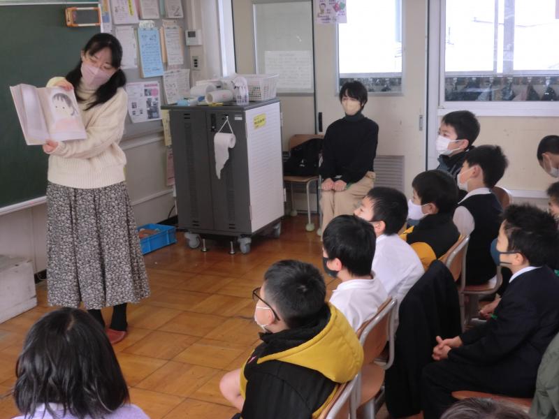 今日は、紙芝居の先生「のまりん」こと野間先生が2年生のために学校に足を運んでくださいました。野間先生の紙芝居の世界に子どもたちはあっという間に引き込まれ、時には身を乗り出してくる子がいるほどの、まさに野間マジック! 野間先生は場面や人物に合わせて声色を巧みに変え、時には表情も変え、迫真の演技でした。45分間の紙芝居でしたが、1話終わるごとに野間先生の楽しいトークが織り込まれるため、誰も飽きることなく次々と広がるお話の世界を聞き続けていました。6年生の担任から、「今日、6年生から『僕たちに、のまりんの紙芝居はないのですか』と聞かれましたよ。」というリクエストの声も聞こえてきました。本校では、低学年対象でのまりんの時間の設定しているのですが、高学年でも聞きたくなるくらいの「のまりんワールド」なのだと実感しました。