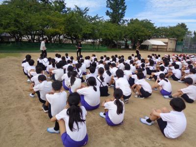 そのあと、日差しの下での練習となりましたが、13分ほどで切り上げて、日陰に戻った後の水分補給と冷房の入った教室でのクールダウンをしました。まだまだ暑い日は続きます。子どもたちの健康に注意しながらの練習内容を工夫していきます。