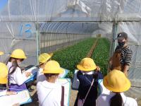 3年生は社会科で「農家の仕事」について学習します。お店で簡単に手に入るおいしい野菜。その野菜が食卓に届くまでの、生産に携わっている人々の工程を知る学習です。今日は、実際に農業に携わっている方のお話を伺いに湖西の「笠間農園」さんにおじゃましました。笠間農園さんが主に生産しているのは「小松菜」です。社長さんが、袋に入った小松菜を子どもたちに見せたとたん「それ知っとる」「昨日食べた」「お母さん、それ買ってきた」と口々に反応していました。たくさんあるビニルハウスを巡り、おいしい小松菜を一年を通して食卓に届けるための仕事を分かりやすく説明してくださいました。