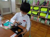 1組さんは「図工」の授業でした。黒板には <すてきないれものをつくろう> と書いてあります。どうやら、家から持ち寄った箱や袋に自分なりの飾りつけをして作品を仕上げるようです。はさみの使い方やのりの付け方など、1学期の様子と比べてみると、とても成長を感じました。完成が楽しみです。