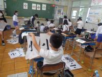 3年生の教室では、書写に挑戦。毛筆を4月から習っていますが、ハネや点の運筆も学習して、上手に「小」という字を練習していました。