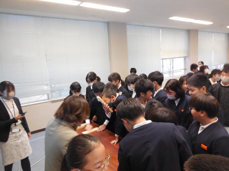 11月14日(火)5・6限 今回は、日本海内灘砂丘凧の会の方々に来ていただき、作り方を教えていただいて、凧作りをしました。作ったのは、自分が選んだ漢字一文字をデザインした凧です。これを、連凧にして、来年、砂浜で揚げるのが楽しみです。