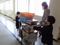 配膳室から、係の子が、ワゴン車を運んできます。みんなの給食をこぼしてしまっては大変とばかりに、慎重にそろりそろりと運んでいます。