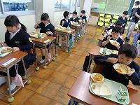 初めての給食はおいしかったかなと聞くと、一斉に「おいしー。」「最強や。」「まだまだ食べられるくらいやわ。」と感想を教えてくれました。