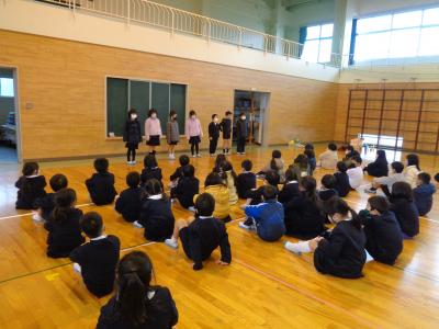 お客さんは1年1組のお友達です。ちょっと寒い体育館でしたが、遊んでいる内に体も心もぽかぽかに!