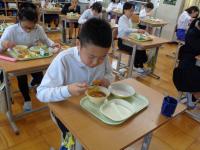 5年1組に入ってみると、みんなおいしそうにカレーライスをほおばっていました。