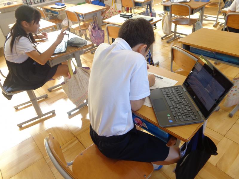 授業では、タブレットを使ったり、ノートに考えを書き記したり、友達と考えを交わし合ったりする姿が見られます。