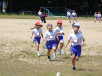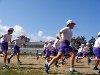 スタートするときの間隔をあけるために、スタート地点に印を入れたり、ゴール後は呼気が激しくなるため、間隔をあけて待機できるよう玉入れの玉でマーキングしました。また、熱中症対策として、準備運動の後、全員マスクを外してからスタートを切りました。上位を目指して最初からすごいスピードで走り出す子、最後まで走りきることを目標にして自分のペースを意識して走り出す子。一生懸命走るクラスメートを応援する子などいろいろな子どもたちの姿が見られました。高学年のゴール地点で、5年生が「もう、6年生とはいっしょに走れないんだね。」と話していた姿が印象的でした。