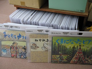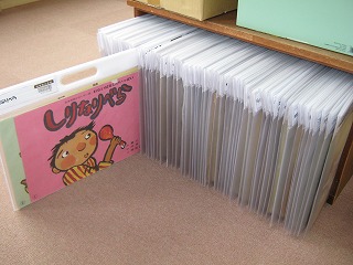 夏休みの作業で紙芝居にバーコードをつけ、貸出ができるようになりました。