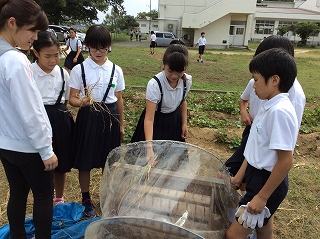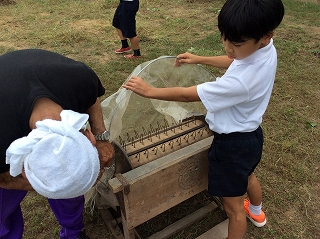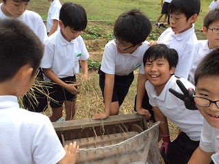 今日は、5年生が4月に植えた稲を収穫し、だっこくを行いました。
