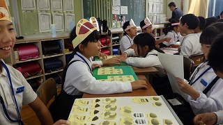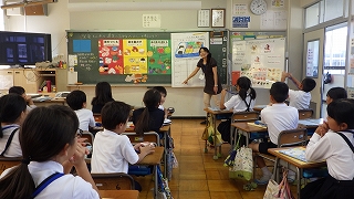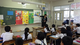 4年生の外国語活動の授業では,「What do you want ~欲しいものは何かな~」の単元で「栄養満点お弁当を作ろう」と単元ゴールを設定し,養護教諭をゲストティーチャーに招いて,お弁当メニューを自分で考えました。お客さんとお店屋さんに分かれて,食材を買い物しました。