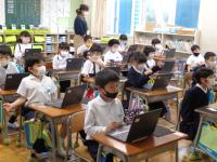 画面が出てきた瞬間の1年生は「やったー」「先生、できました!」と思わず声に出して喜ぶ姿が見られました。今日は、ログインするのに時間がかかり、そのあとは、安全に電源を落として充電庫に収納するところまでを体験しました。