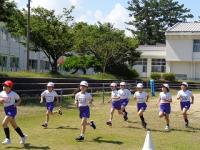 スタートするときの間隔をあけるために、スタート地点に印を入れたり、ゴール後は呼気が激しくなるため、間隔をあけて待機できるよう玉入れの玉でマーキングしました。また、熱中症対策として、準備運動の後、全員マスクを外してからスタートを切りました。上位を目指して最初からすごいスピードで走り出す子、最後まで走りきることを目標にして自分のペースを意識して走り出す子。一生懸命走るクラスメートを応援する子などいろいろな子どもたちの姿が見られました。高学年のゴール地点で、5年生が「もう、6年生とはいっしょに走れないんだね。」と話していた姿が印象的でした。