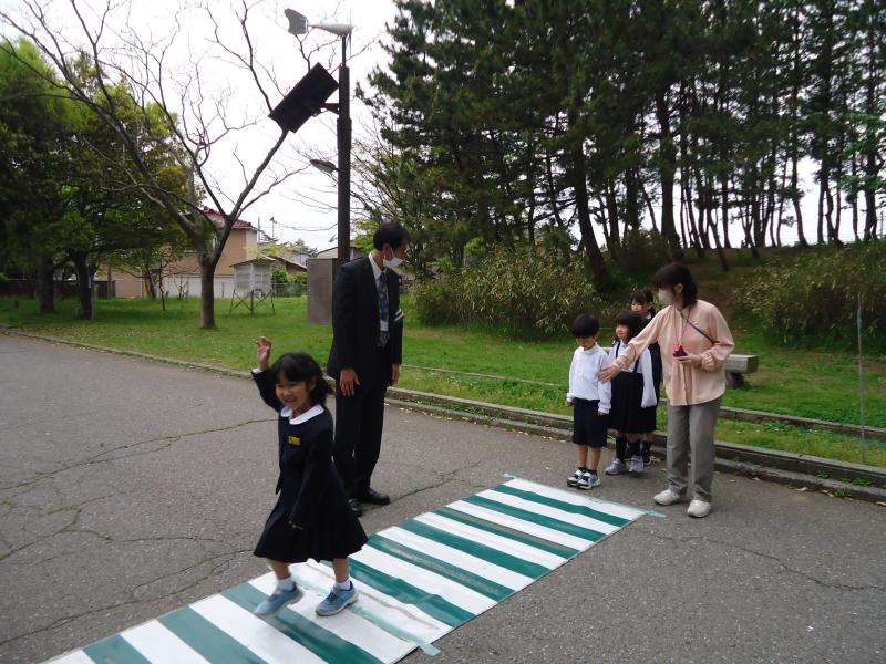 その後、実際に外に出て、車に気をつけて安全に歩く練習や横断歩道の正しい渡り方など体験しました。