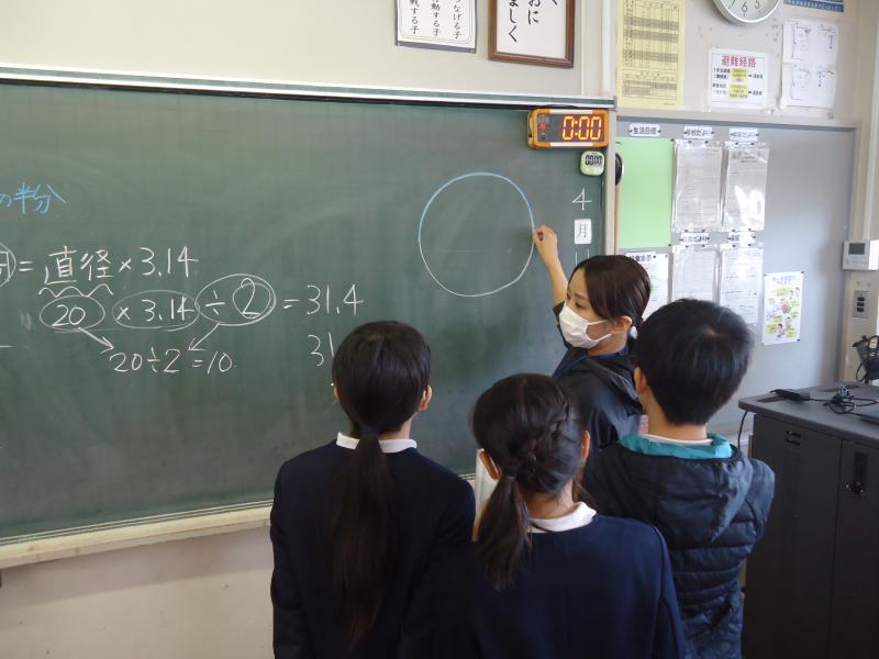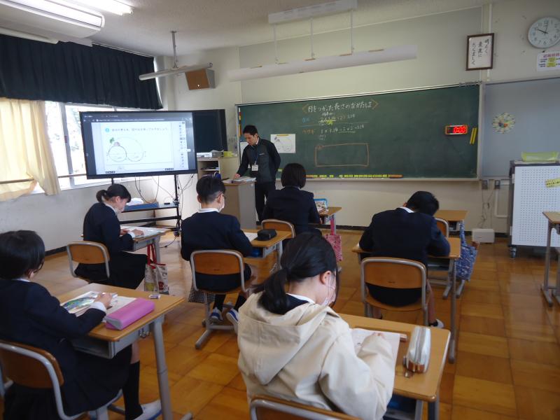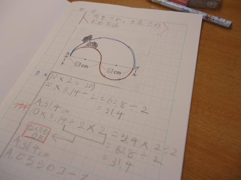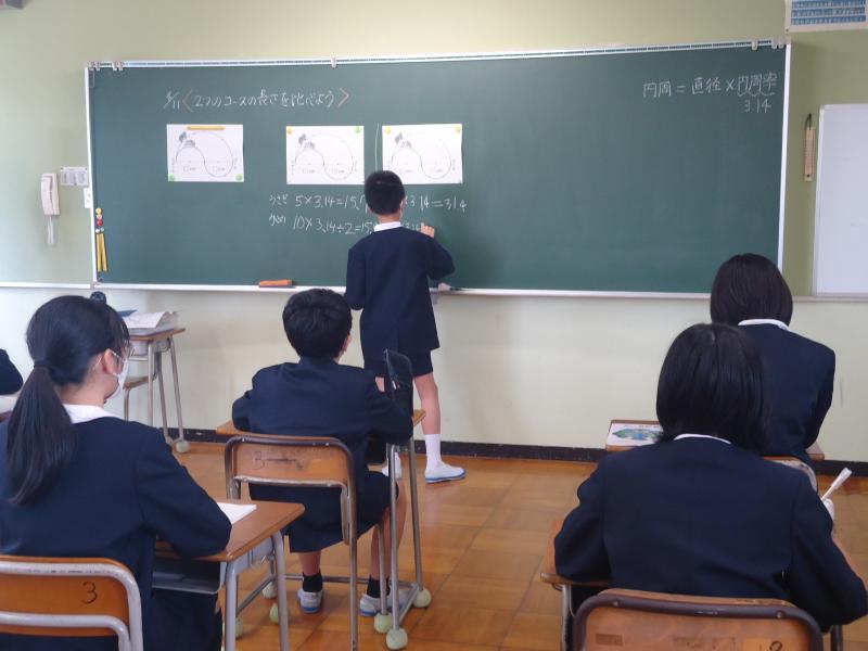 この時間は、6年生の算数のスタート「学びのとびら」。5年生学んだ「円周」を使って、うさぎとかめがそれぞれ通った道のりを比べる学習です。各コースで友達と関わりながら学びを深めていました。