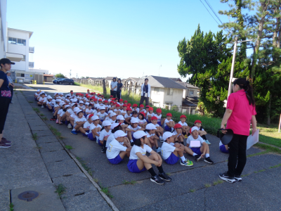 そのあと、日差しの下での練習となりましたが、13分ほどで切り上げて、日陰に戻った後の水分補給と冷房の入った教室でのクールダウンをしました。まだまだ暑い日は続きます。子どもたちの健康に注意しながらの練習内容を工夫していきます。